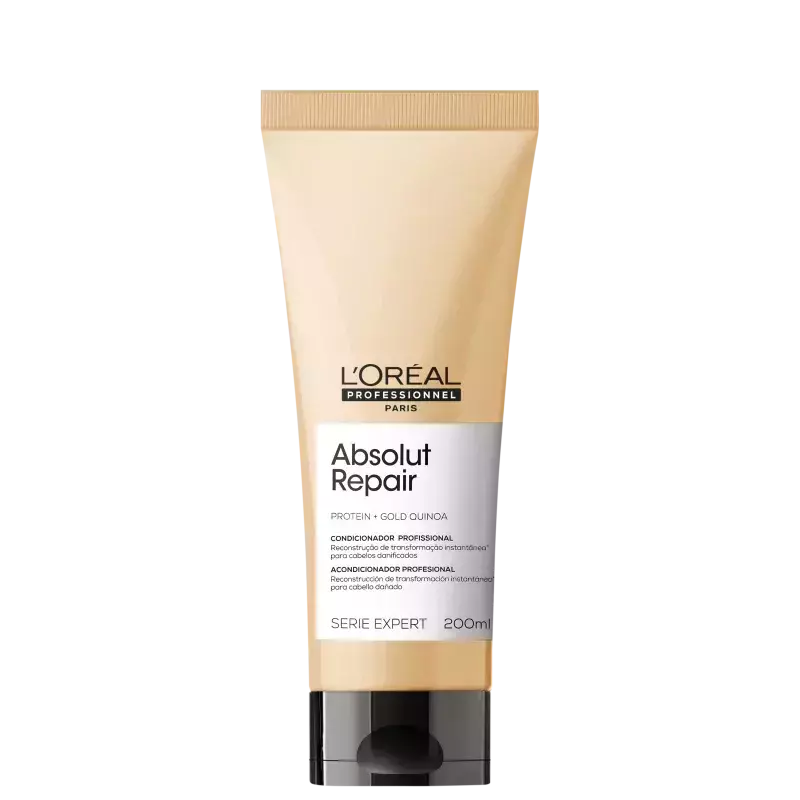 Condicionador para cabelos danificados. L'Oréal Professionnel Serie Expert Absolut Repair Gold Quinoa + Protein desembaraça e reestrutura a superfície do fio para mais brilho e leveza.