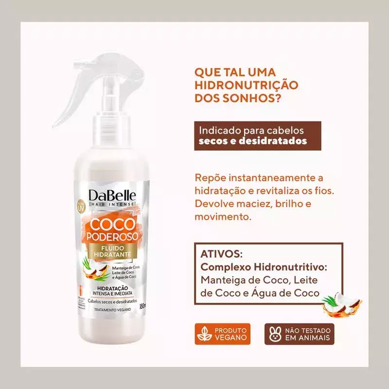 O Fluido Hidratante Coco Poderoso chegou para acabar com a desidratação dos cabelos! Em uma textura levíssima, repõe instantaneamente a hidratação e revitaliza os fios a qualquer momento. Devolve maciez, brilho e movimento, além de deixar um perfume delicioso.