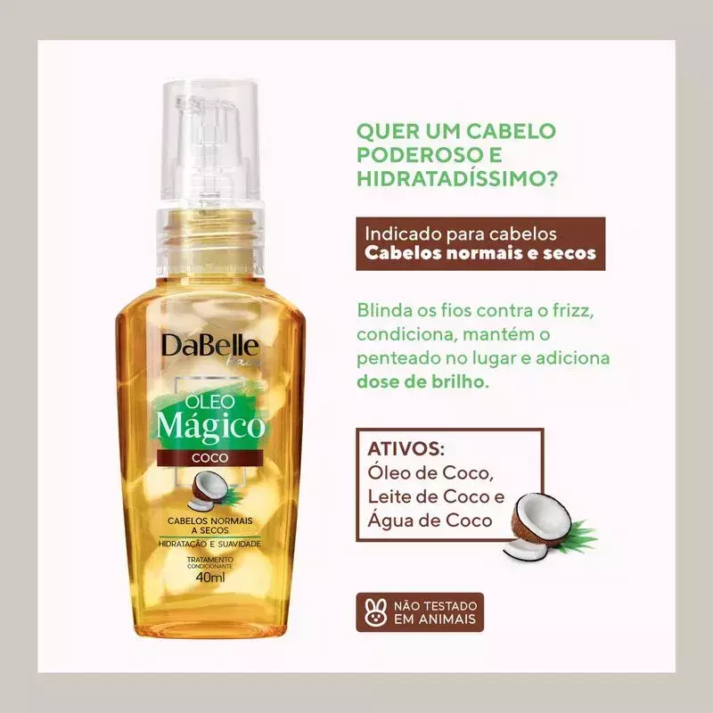 Versátil, o Óleo Mágico Coco DaBelle Hair enriquece o ritual de nutrição, blinda os fios contra o frizz, condiciona, mantém o penteado no lugar e adiciona dose de brilho. Com tamanho perfeito para levar na bolsa e válvula que facilita a dosagem e a aplicação.