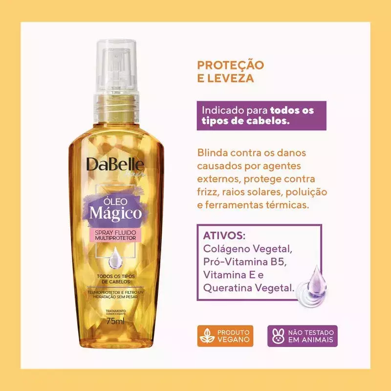 DaBelle Hair Óleo Mágico Spray Multiprotetor tem textura leve que não pesa nos fios e efeito condicionante. Blinda contra os danos causados por agentes externos, protege contra frizz, raios solares, poluição e ferramentas térmicas. Perfeito pra levar na bolsa e válvula spray que facilita a aplicação.