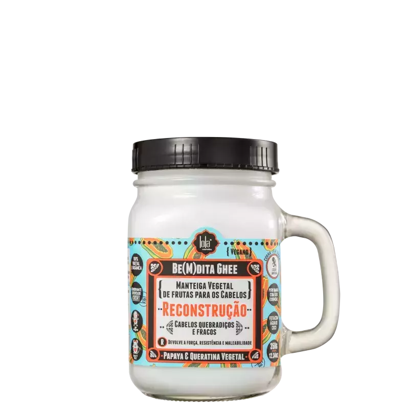 Máscara de reconstrução para cabelos quebradiços e fracos. Lola Cosmetics Be(M)dita Ghee Reconstrução oferece a reposição da massa e resistência do fio.