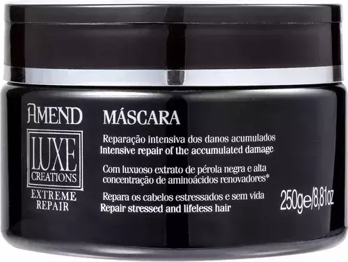 Máscara Amend Luxe Creations Extreme Repair nutre intensamente combinando um sistema de aminoácidos que repõem a estrutura natural dos fios, agindo como um reforçador interno do cabelo e reparando os danos acumulados. Com alta concentração de ativos que combatem os sinais de envelhecimento capilar (cabelos opacos, fracos e desidratados), evitam o desbotamento da cor e recuperam rapidamente os fios, mantendo-os hidratados, fortes, brilhantes e blindados de futuras agressões.