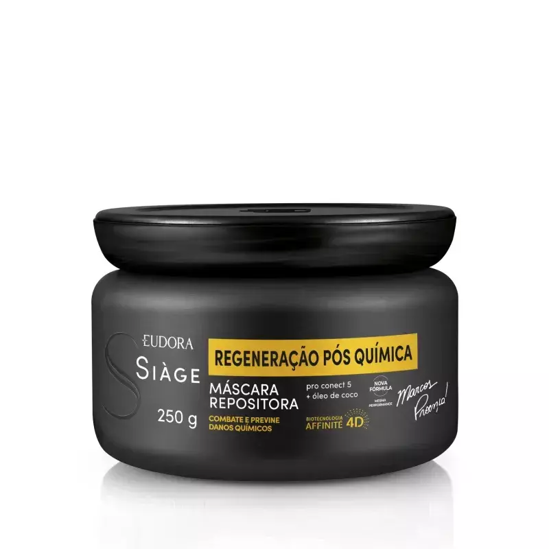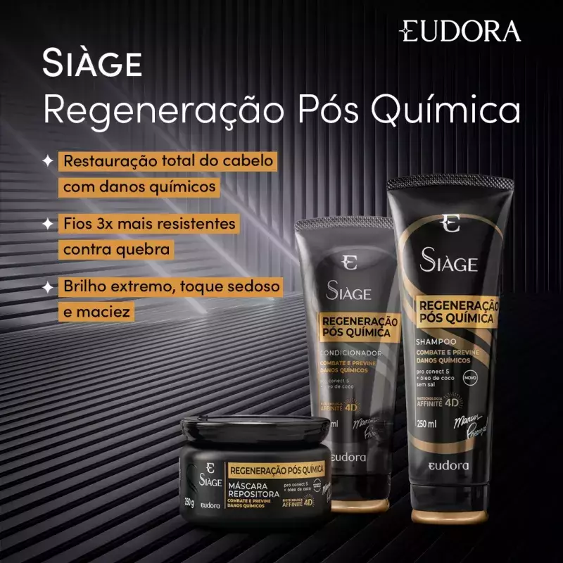A linha Siàge Regeneração Pós Química é assinada pelo expert Marcos Proença, e traz o complexo tecnológico Pro Conect 5 + Óleo de Coco que promove o religamento das pontes capilares dos fios ressecados e quebrados por agressões químicas, garantindo uma linha completa de resultados de salão para seus cuidados capilares diários.