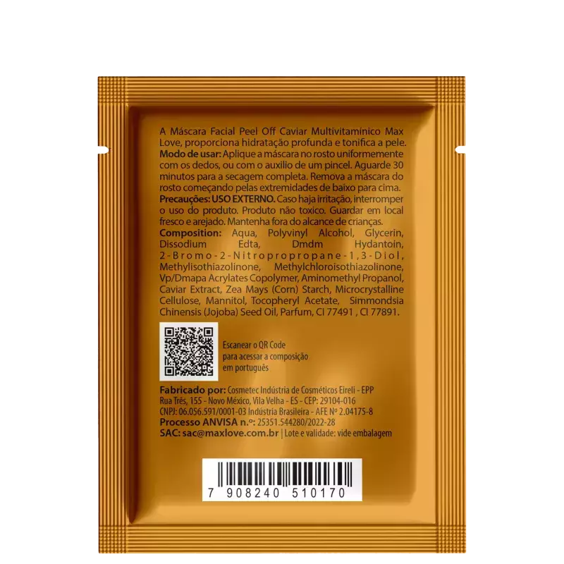 A Máscara Facial Max Love Peel Off Caviar Multivitamínico promove uma pele mais nutrida e saudável.