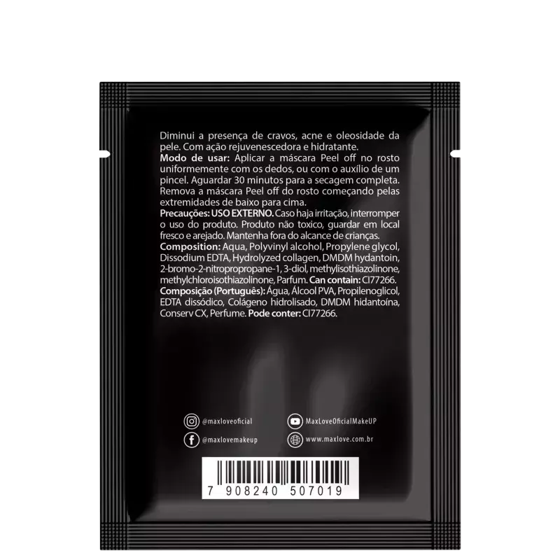 A Máscara Facial Max Love Peel Off Total Black promove ação rejuvenescedora e hidratante, é ideal para complementar a rotina de cuidados com a pele.